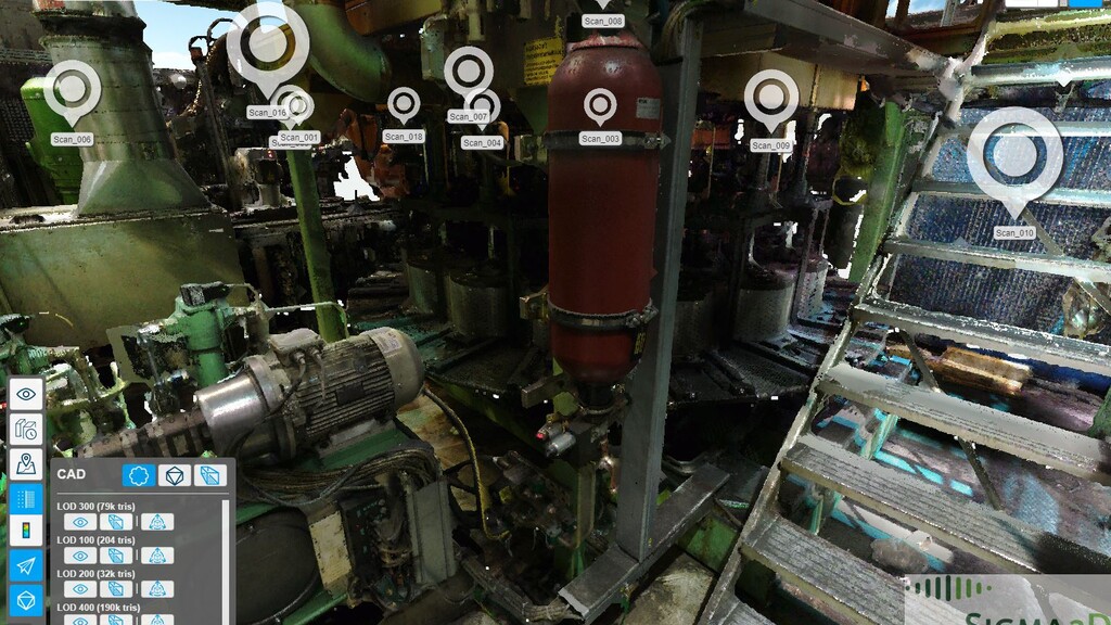 Another way to compare TLS data and CAD models is to import them into a web-based software tool specifically designed to visually compare 3D data. Such tools allow the user to visually identify discrepancies and matches between the two data sets and perform visual model checks. An example of such software is the cloud software FARO WebShare or FARO Sphere.